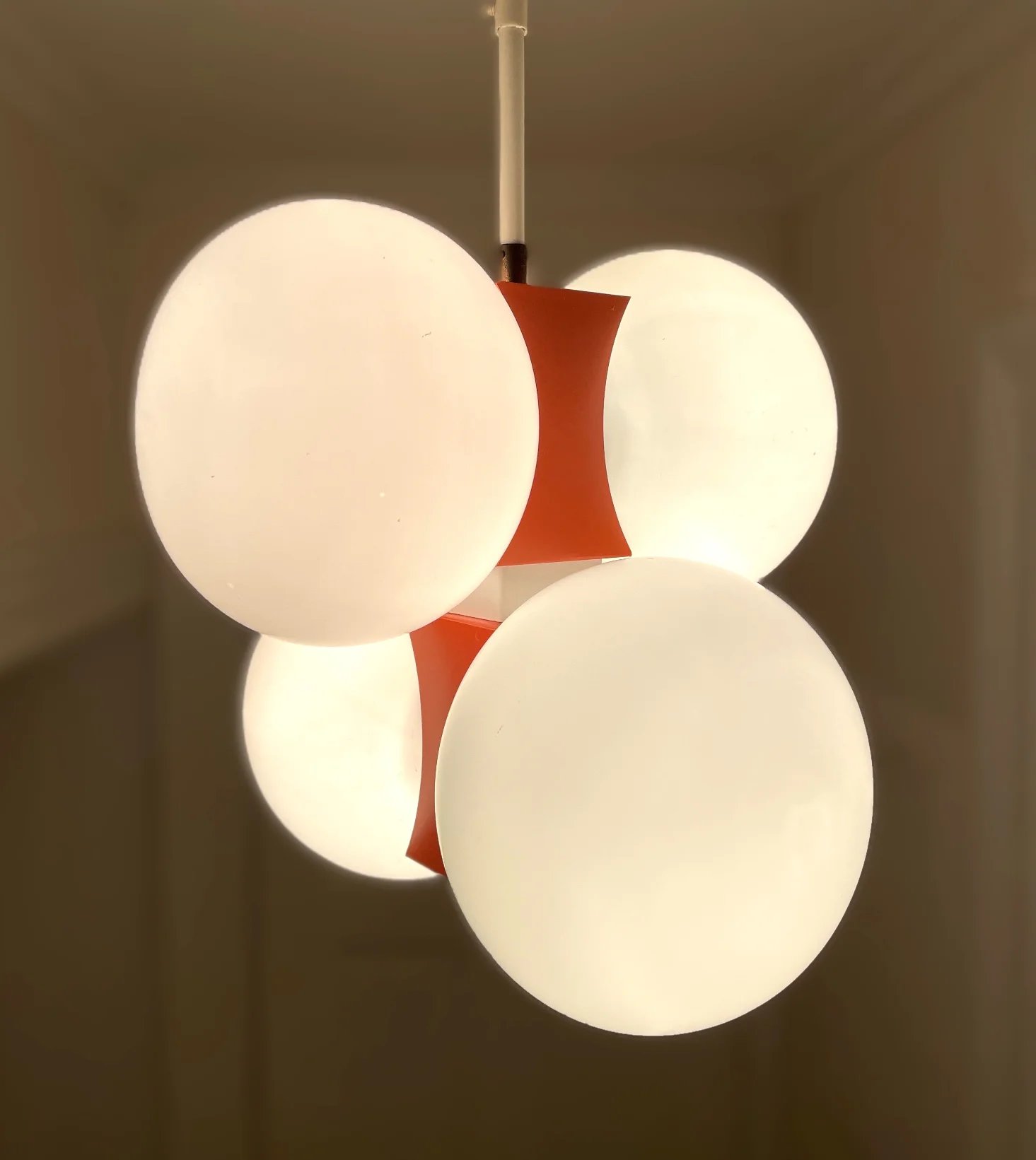 Kaiser Leuchten oransje pendellampe, ca 1970. Flott lampe i atomium-form med 4 opalin glasskuler. Denne utsøkte belysningsarmaturen har en fengslende oransje farge som tilfører en touch av sofistikerthet og ro til ethvert rom. Opalglasset utstråler et mykt, diffust lys, som skaper en varm og innbydende atmosfære. Høy kvalitet og i meget god stand. Rengjort, godt tilkoblet og klar til bruk. Armaturen krever 4 x E14 små pærer med maks 40W. Sjekk ut lignende produkter i vår butikk