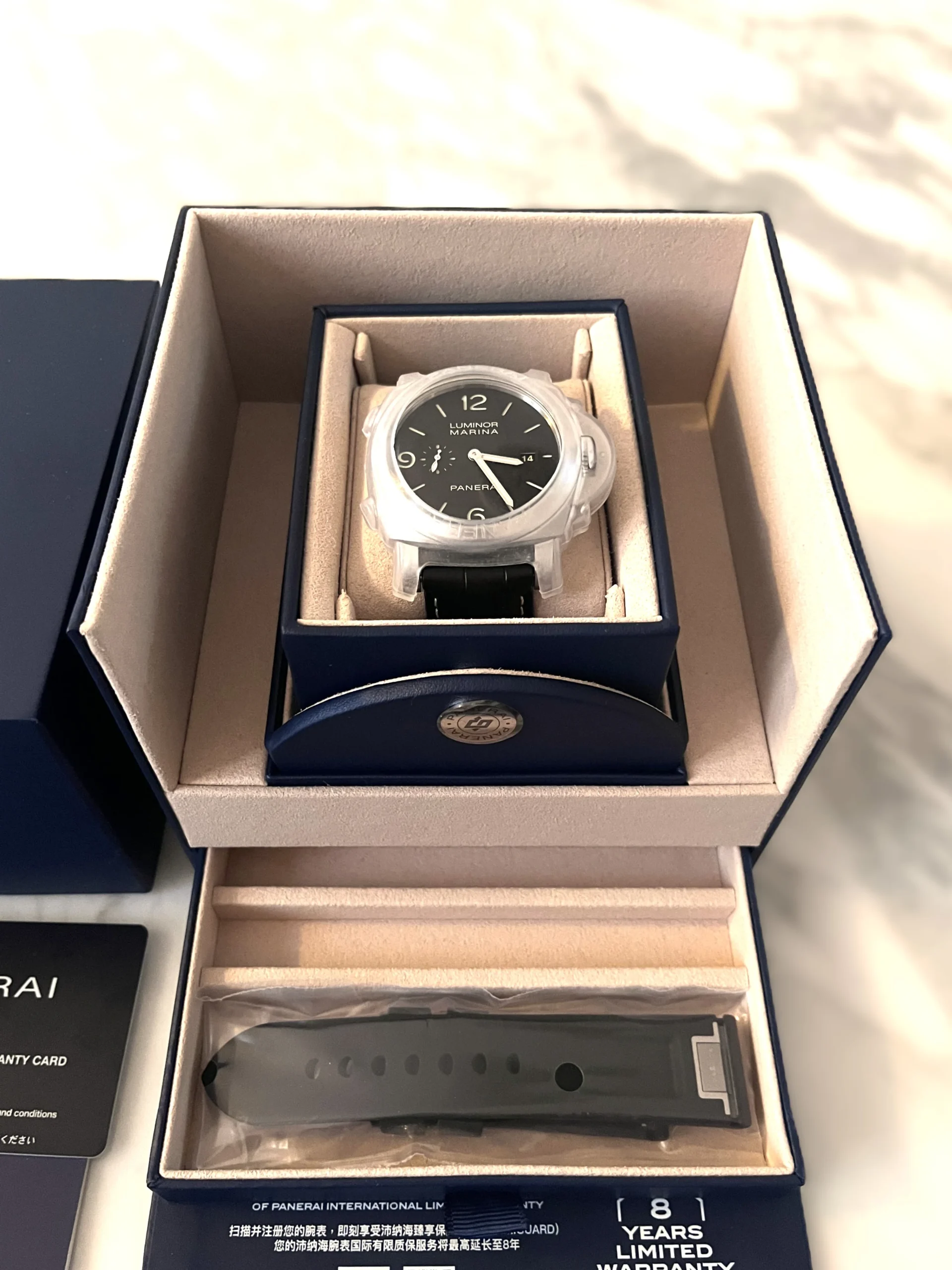 Denne Panerai Luminor Marina er ubrukt og fremstår som helt ny.