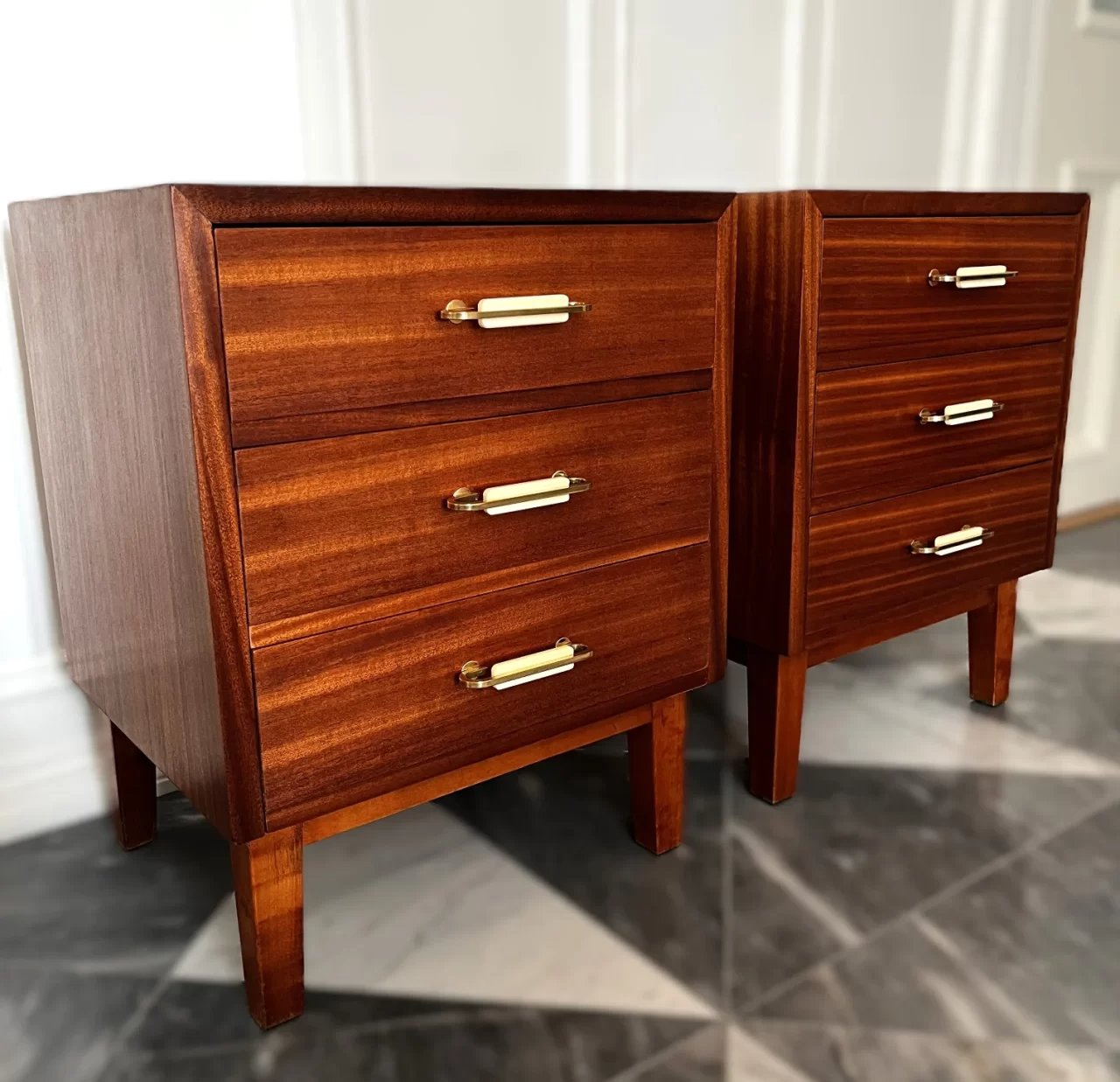 Retro nattbord i teakfinér med håndtak i messing og hvit bakelitt fra 1950-tallet. Designer og produsent ukjent. Dette nattbord-paret er i svært god vintage kondisjon med minimalt med bruksmerker. Retro nattbord i teakfinér er renovert og oljet. Sjekk ut lignende produkter