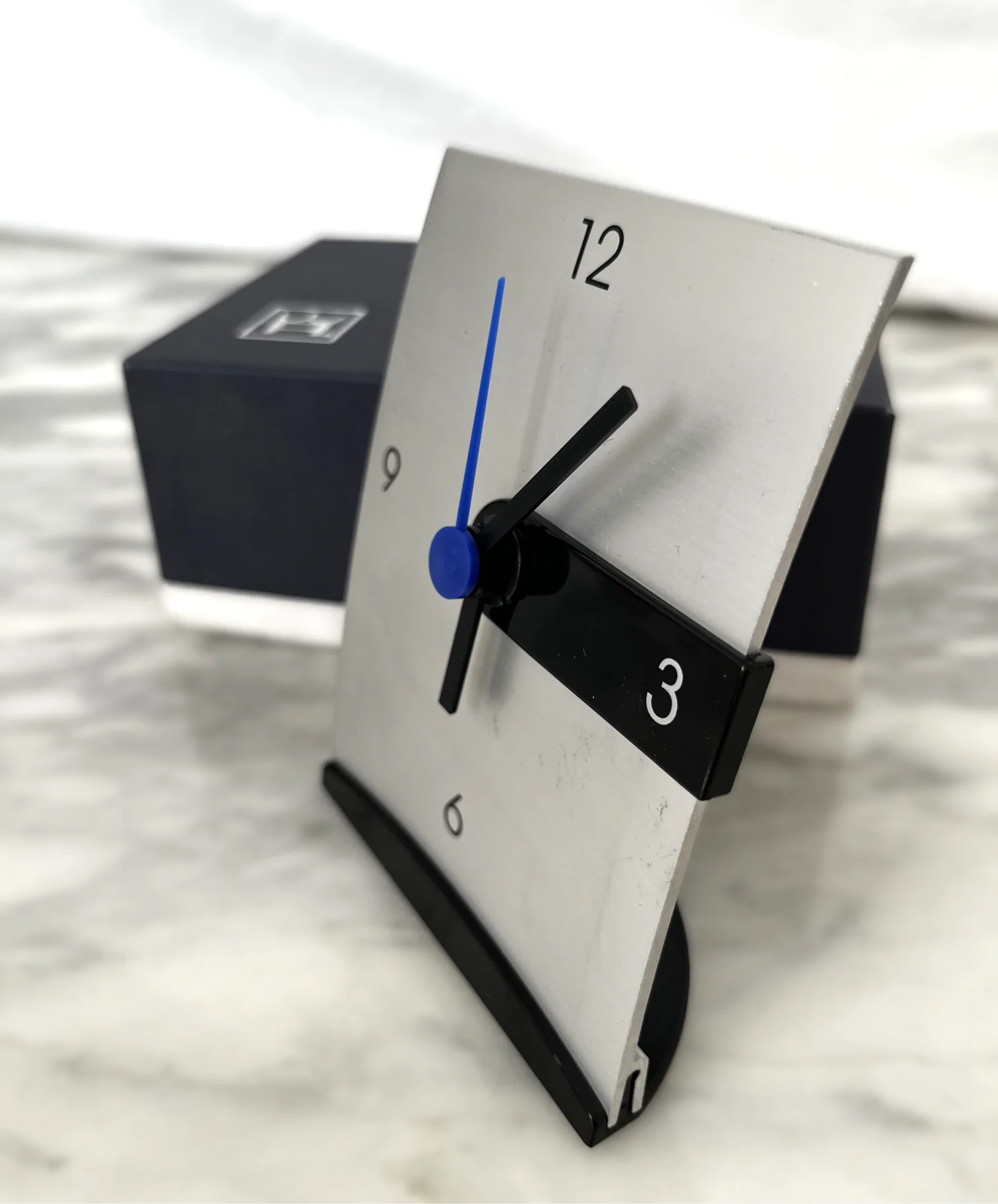 Vintage AACHEN aluminiums bordklokke fra 1980-tallet. Klokken er i perfekt fungerende stand med svært lite bruksspor. Kommer i original eske. Drives av 1 LR6 (AA) batteri. De strømlinjeformede linjene og det minimalistiske uttrykket gjør den til et perfekt tillegg til enhver retro hjemmeinnredning. Ikke bare et stilig statement, men også en fullt funksjonell klokke. En tidløst Vintage Bauhaus Quartz Bordklokke. Sjekk ut lignende produkter